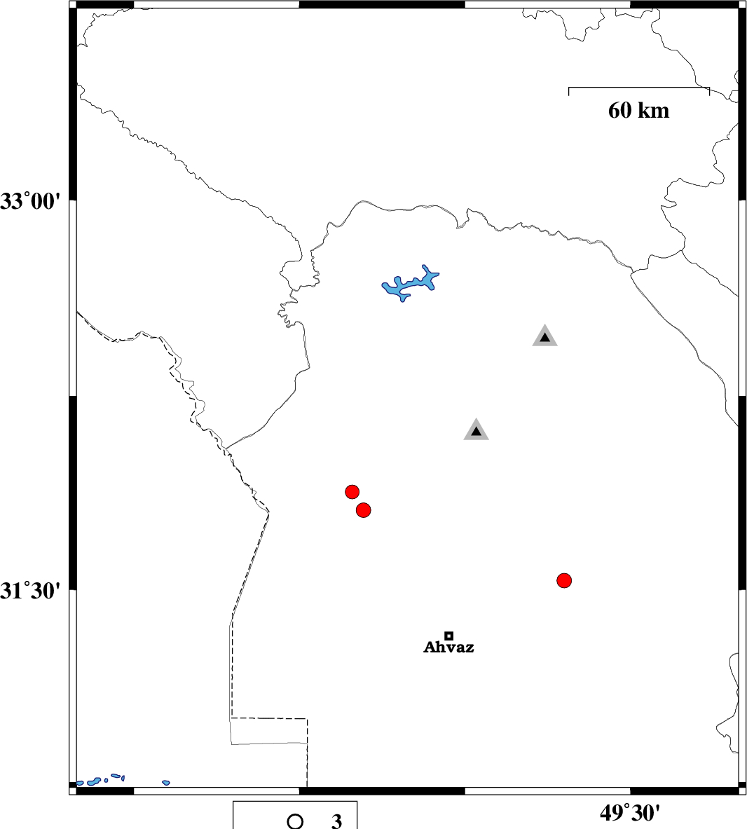 | 2009/02/07 | 10:31:09.3 | 14:01:09.3 | 31.16 | 48.43 | 30 | ML:3.2 | 29 km South-West of Ahvaz, Khoozestan Province | ||
