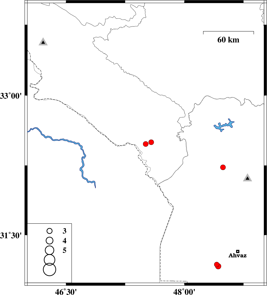 | 2009/02/10 | 15:30:25.2 | 19:00:25.2 | 31.18 | 48.41 | 14 | ML:2.8 | 30 km South-West of Ahvaz, Khoozestan Province | ||