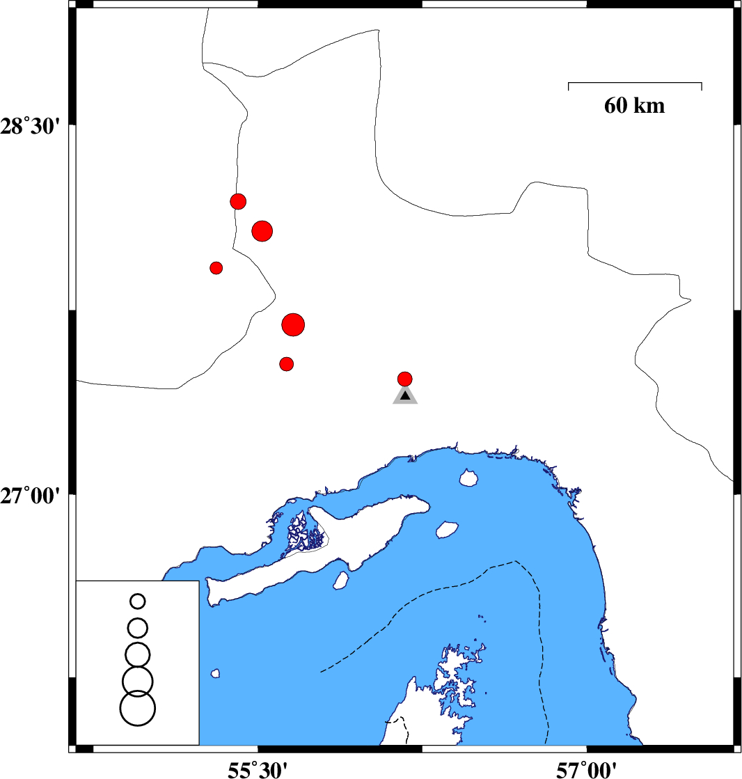 2009/02/23 11:11:00.5 14:41:00.5 27.6955.6618 ML:4.7 73 km South-West of Hajiabad, Hormozgan Province