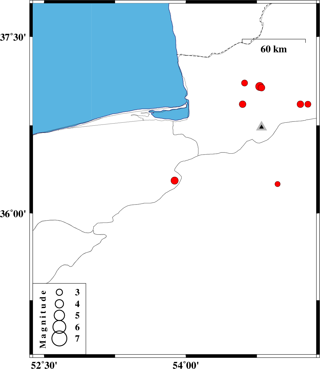 | 2009/02/06 | 00:43:24.1 | 04:13:24.1 | 36.93 | 55.21 | 14 | ML:3.3 | 11 km Ramian, Golestan Province |