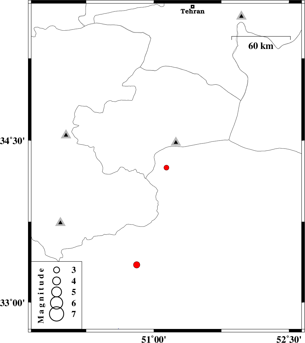 | 2009/03/16 | 11:30:40.6 | 15:00:40.6 | 33.35 | 50.81 | 15 | ML:3.2 | 47 km North-East of Khvansar, Esfahan Province |