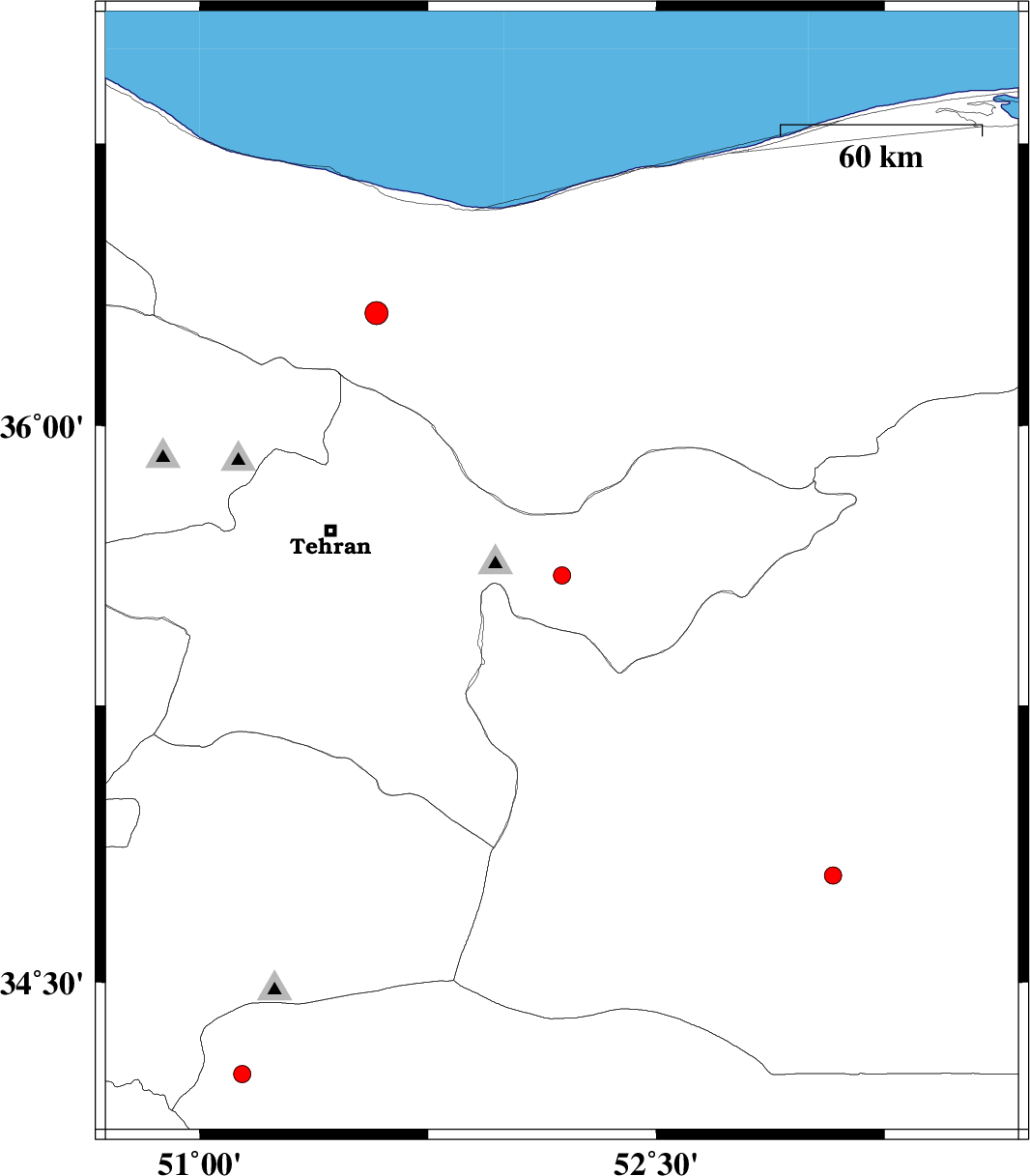 | 2009/03/17 | 10:32:23.5 | 14:02:23.5 | 34.79 | 53.08 | 47 | ML:2.6 | 82 km South-East of Garmsar, Semnan Province |
