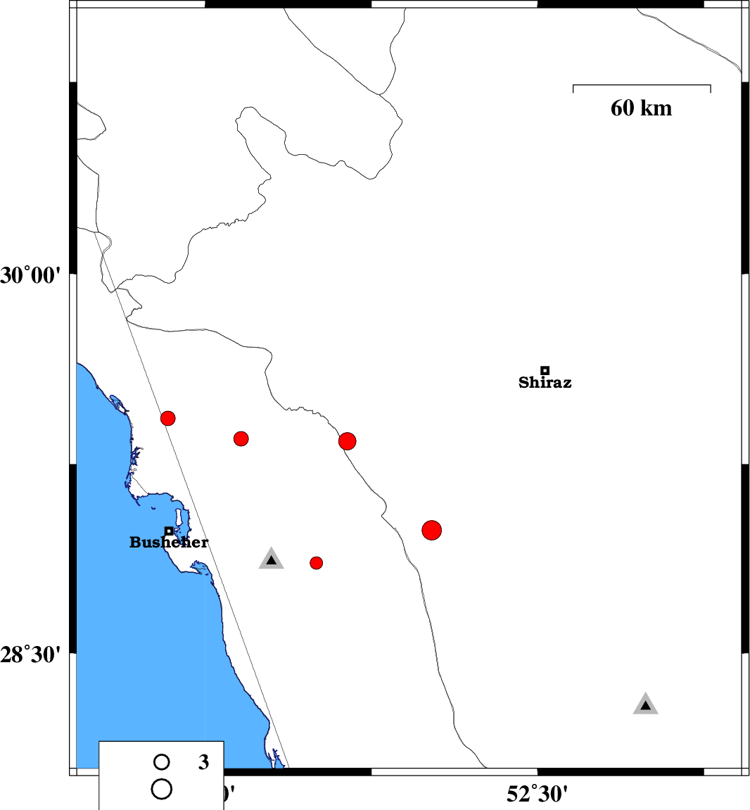 | 2009/03/24 | 15:45:10.0 | 20:15:10.0 | 29.54 | 51.92 | 46 | ML:3.9 | 26 km East of Kazerun, Fars Province | ||