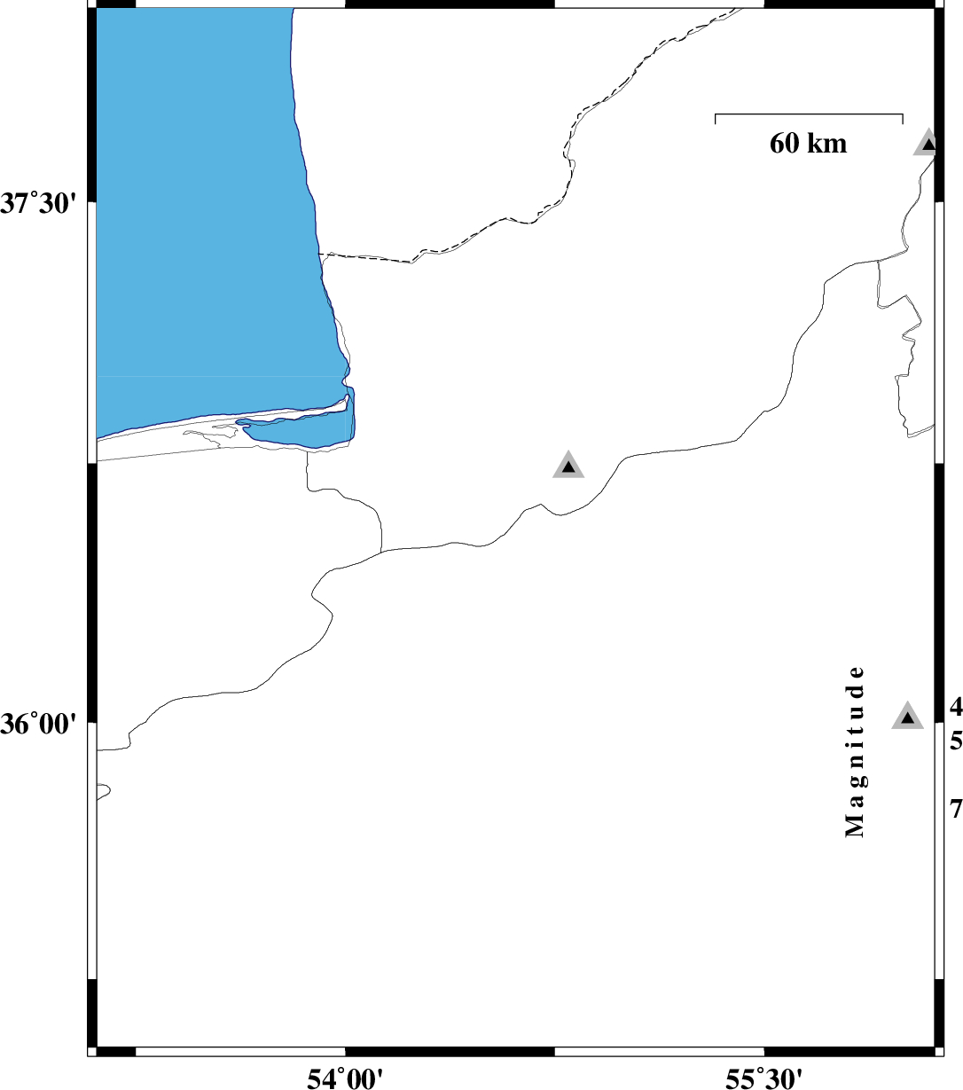 | 2009/03/16 | 06:17:09.1 | 09:47:09.1 | 37.23 | 54.47 | 14 | ML:3.2 | 23 km North of Aq Qaleh, Golestan Province | ||