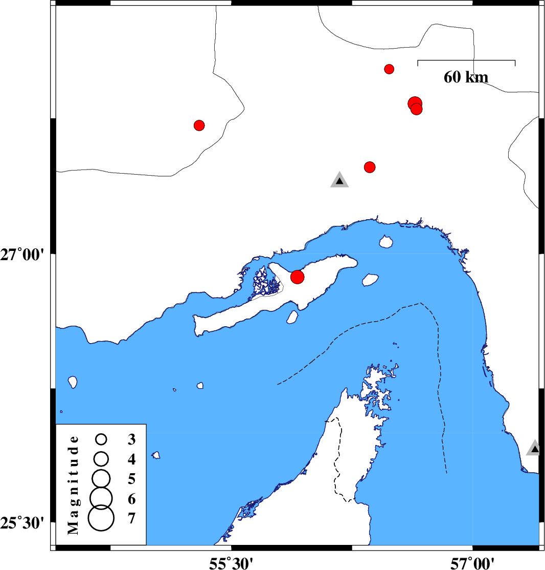| 2009/04/14 | 05:10:26.6 | 09:40:26.6 | 26.87 | 55.91 | 8 | ML:3.8 | Persian Gulf, 36 km West of Qeshm | ||
