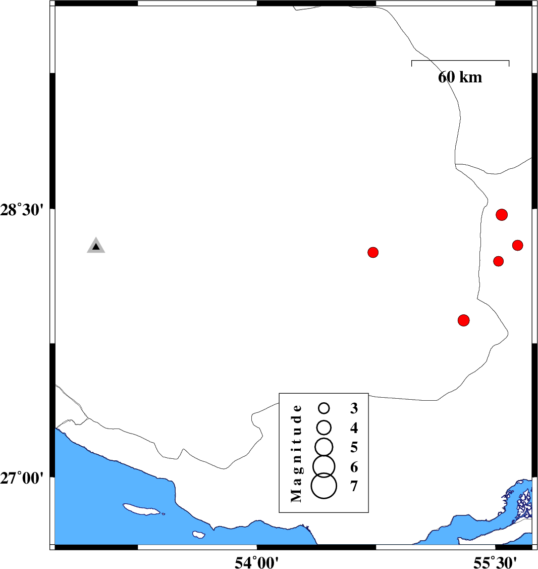 | 2009/04/21 | 16:43:37.1 | 21:13:37.1 | 28.12 | 54.23 | 15 | ML:3 | 49 km North-West of Lar, Fars Province | ||