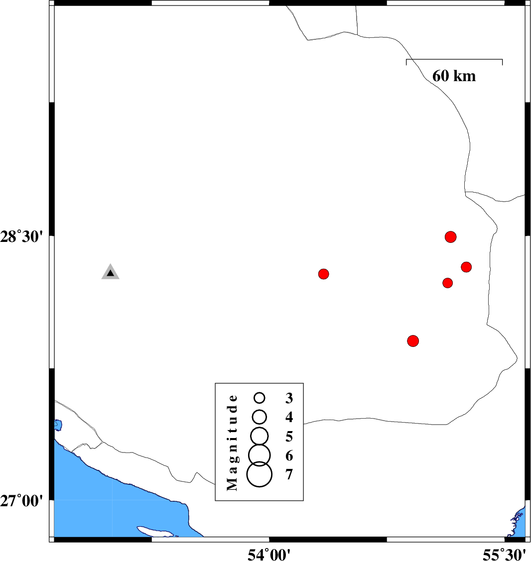2009/04/21 16:47:52.0 21:17:52.0 28.2954.1315 ML:3.2 60 km South-East of Jahrom, Fars Province