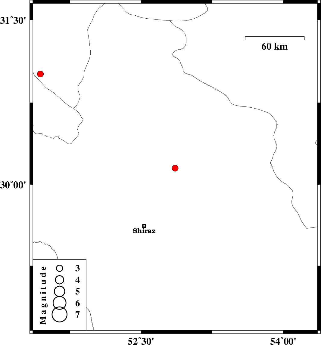 | 2009/04/27 | 02:36:01.4 | 07:06:01.4 | 30.15 | 52.86 | 15 | ML:2.9 | 31 km North of Marvdasht, Fars Province | ||