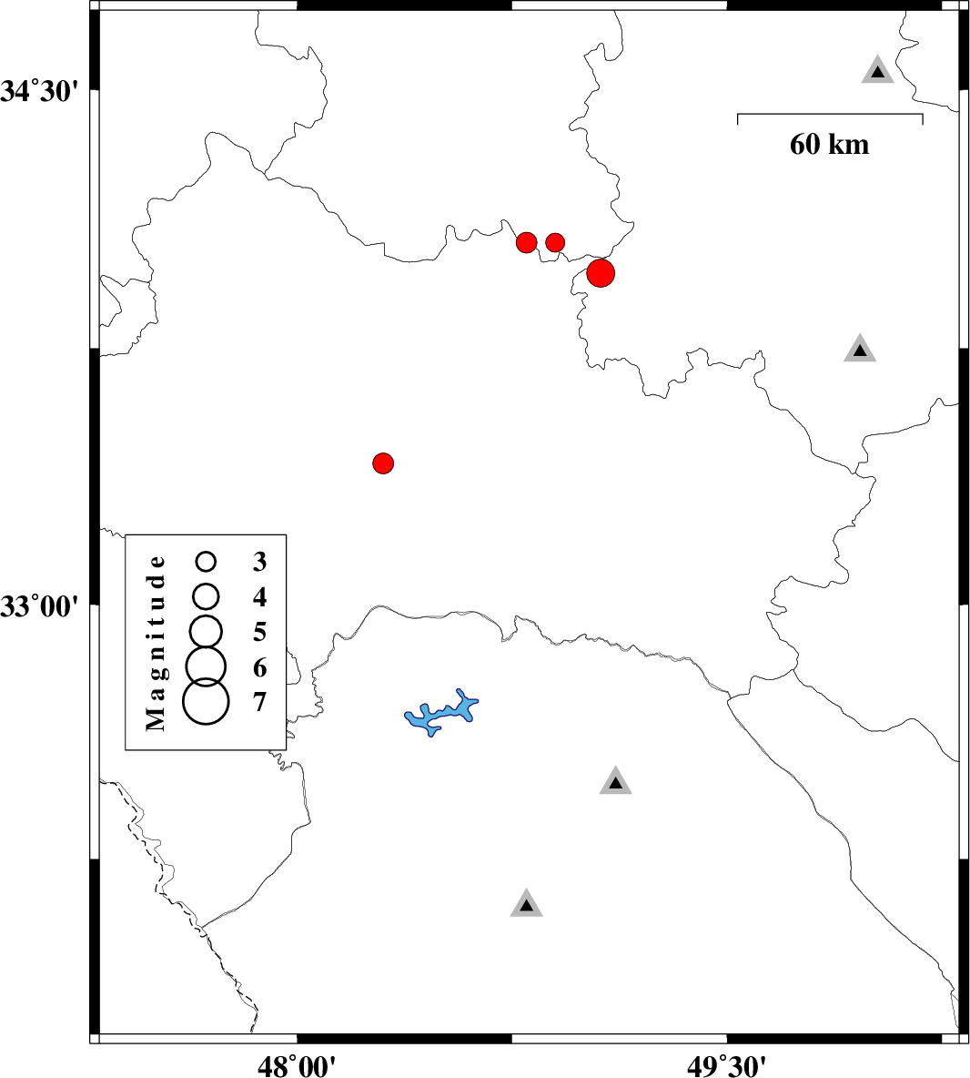 | 2009/04/29 | 21:19:27.2 | 01:49:27.2 | 33.23 | 48.81 | 6 | ML:2.9 | 37 km South-West of Dorud, Lorestan Province | ||