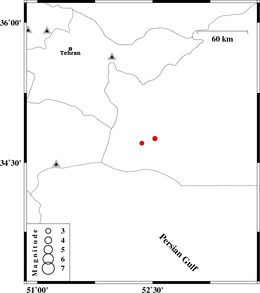 | 2009/05/06 | 14:58:05.6 | 19:28:05.6 | 34.76 | 52.53 | 28 | ML:2.8 | 54 km South-East of Garmsar, Semnan Province | ||