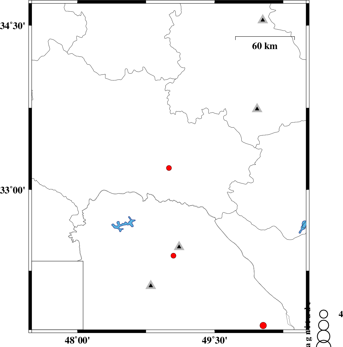 | 2009/05/18 | 15:09:31.7 | 19:39:31.7 | 33.2 | 49 | 15 | ML:2.6 | 32 km South of Dorud, Lorestan Province | ||