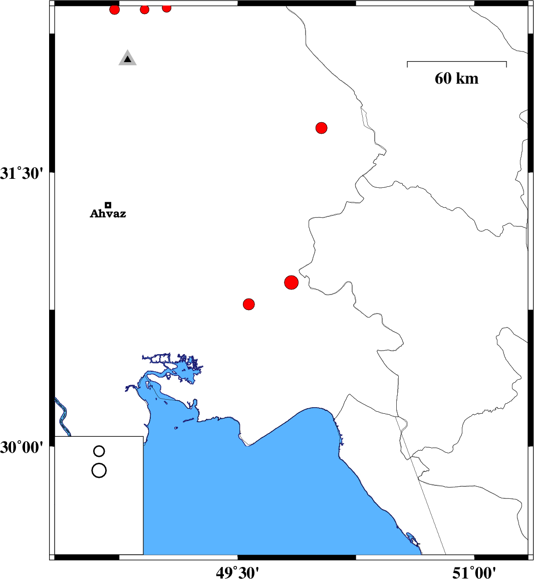 | 2009/04/26 | 05:43:59.0 | 10:13:59.0 | 30.78 | 49.57 | 36 | ML:3.2 | 13 km West of Omidiyeh, Khoozestan Province |
