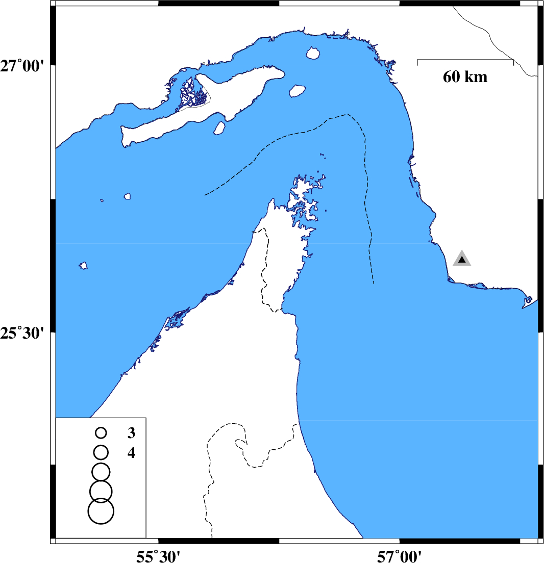 | 2009/06/08 | 18:13:57.6 | 22:43:57.6 | 25.83 | 56.36 | 16 | ML:3.7 | 110 km North-East of Sharjah in United Arab Emirates |