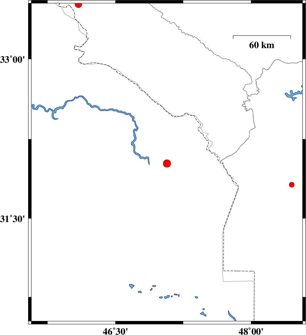 | 2009/06/12 | 09:21:52.3 | 13:51:52.3 | 31.82 | 48.45 | 31 | ML:2.6 | 38 km North-East of Susangerd, Khoozestan Province |