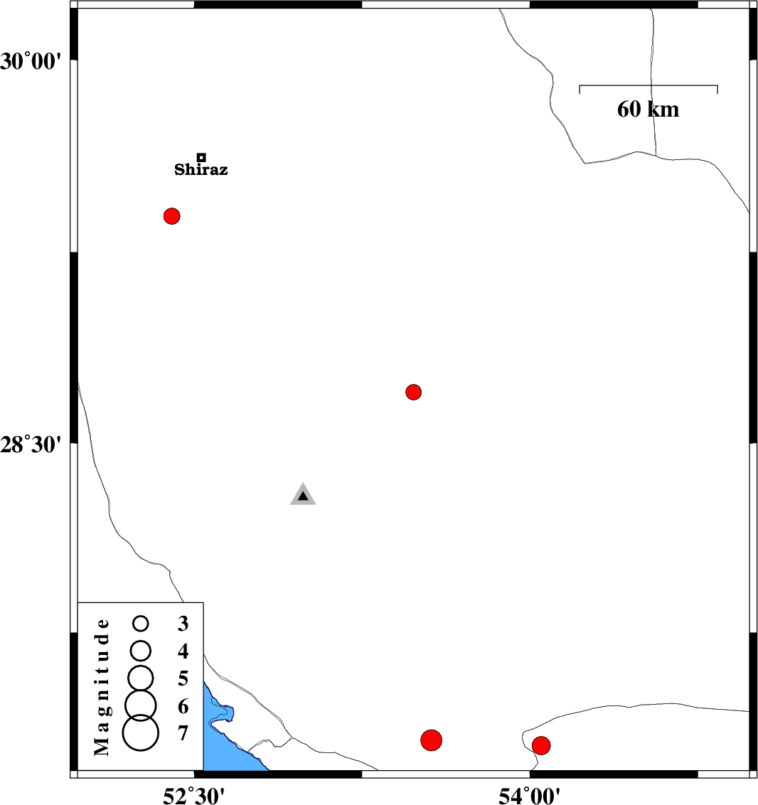 | 2009/06/22 | 08:49:40.6 | 13:19:40.6 | 28.7 | 53.48 | 14 | ML:3.1 | 23 km North of Jahrom, Fars Province | ||