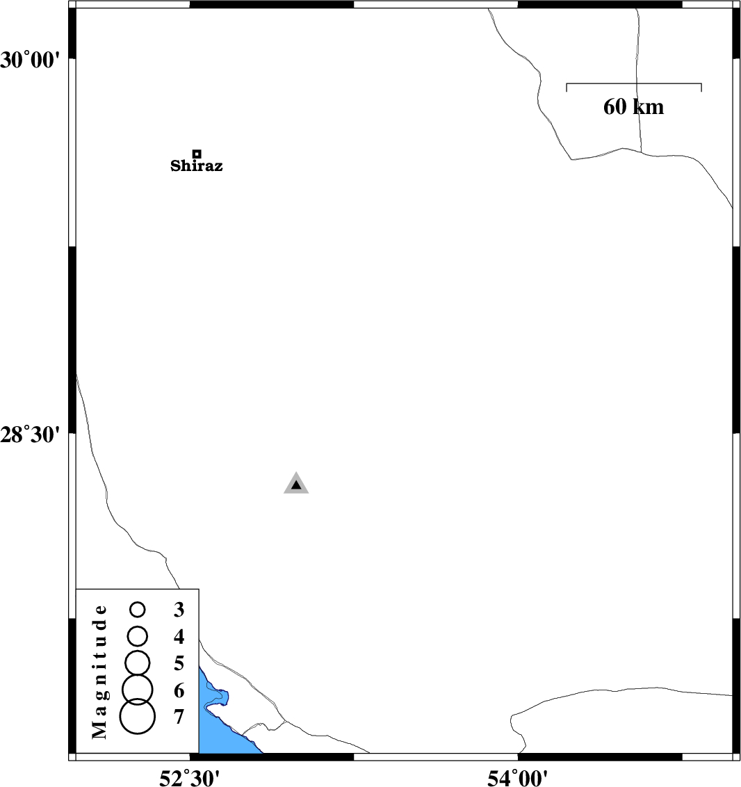 | 2009/06/22 | 08:49:40.6 | 13:19:40.6 | 28.7 | 53.48 | 14 | ML:3.1 | 23 km North of Jahrom, Fars Province |