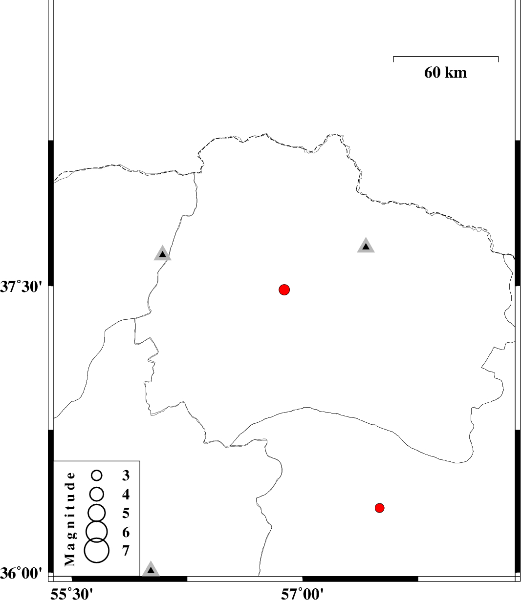 | 2009/06/30 | 10:09:20.3 | 14:39:20.3 | 37.48 | 56.88 | 28 | ML:3.1 | 9 km Ashkhaneh, Khorasan(north) Province | ||