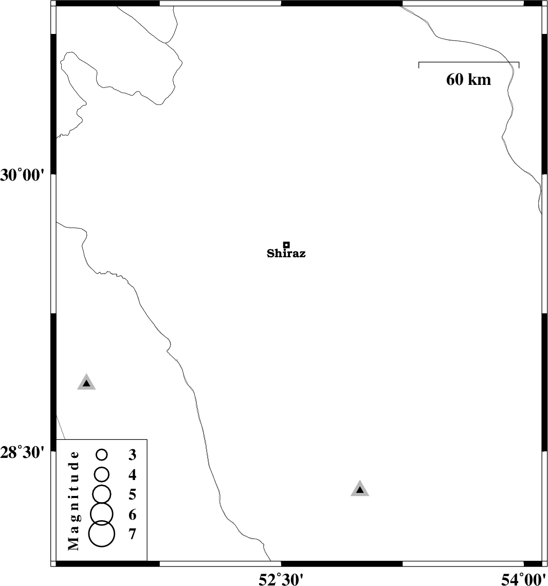 | 2010/01/08 | 02:28:18.5 | 05:58:18.5 | 29.4 | 52.61 | 46 | ML:3 | 25 km South of Shiraz, Fars Province |