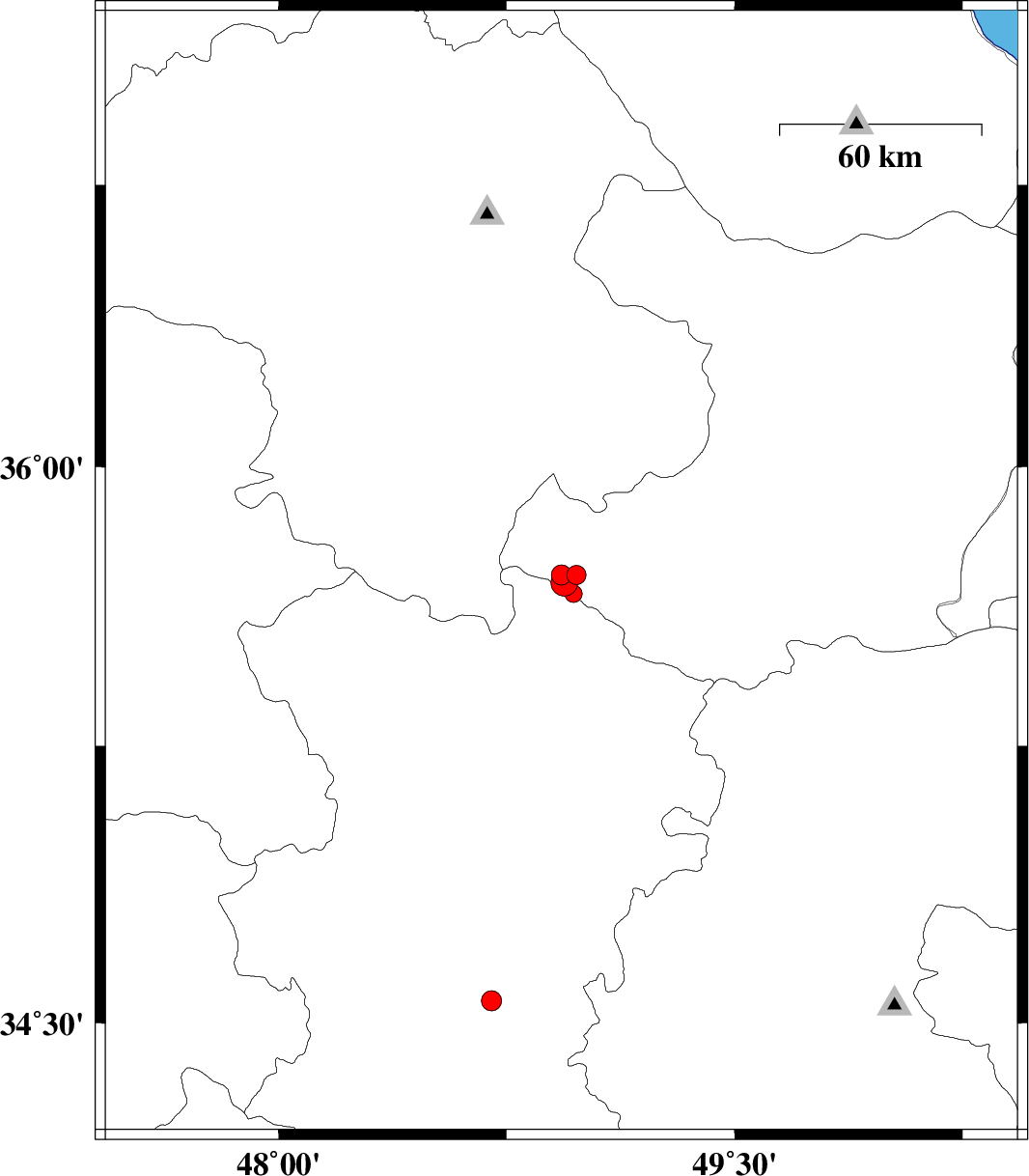 2010/01/08 | 00:07:37.6 | 03:37:37.6 | 34.56 | 48.7 | 14 | ML:2.9 | 22 km East of Tuyserkan, Hamedan Province |