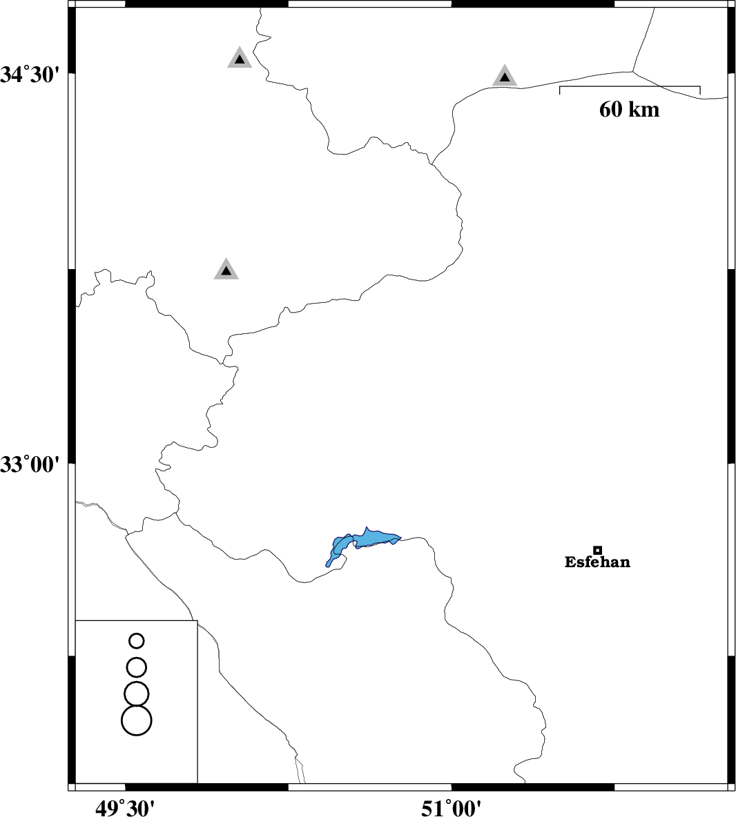 2010/01/13 | 20:54:16.1 | 00:24:16.1 | 33.25 | 50.77 | 14 | ML:2.5 | 41 km East of Khvansar, Esfahan Province |