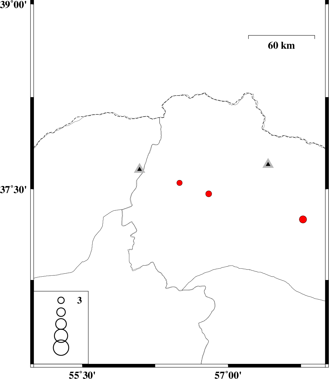2010/01/30 | 13:50:04.2 | 17:20:04.2 | 37.25 | 57.77 | 14 | ML:3.4 | 20 km South-West of Shirvan, Khorasan(north) Province | ||