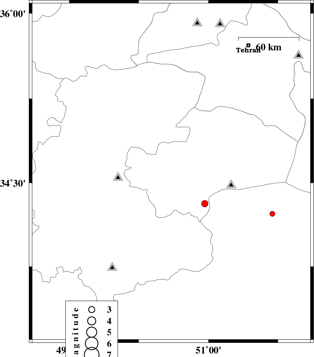 2010/01/16 | 05:48:06.5 | 09:18:06.5 | 34.5 | 51.33 | 6 | ML:2.6 | 45 km South-East of Qom, Qom Province | ||
