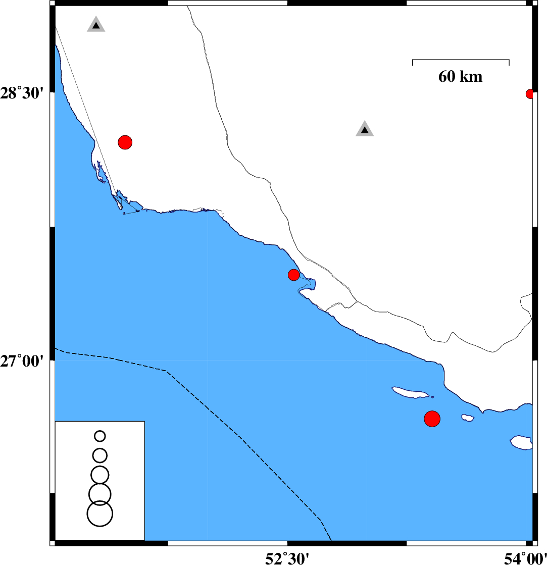 | 2010/02/04 | 23:40:08.6 | 03:10:08.6 | 27.48 | 52.54 | 20 | ML:3.3 | Persian Gulf, 35 km West of Mehr | ||