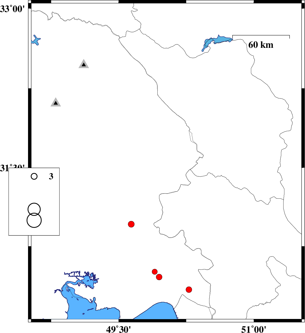 2010/02/08 | 21:55:27.3 | 01:25:27.3 | 31.55 | 50.03 | 14 | ML:2.9 | 13 km East of Bagh Malek, Khoozestan Province | ||