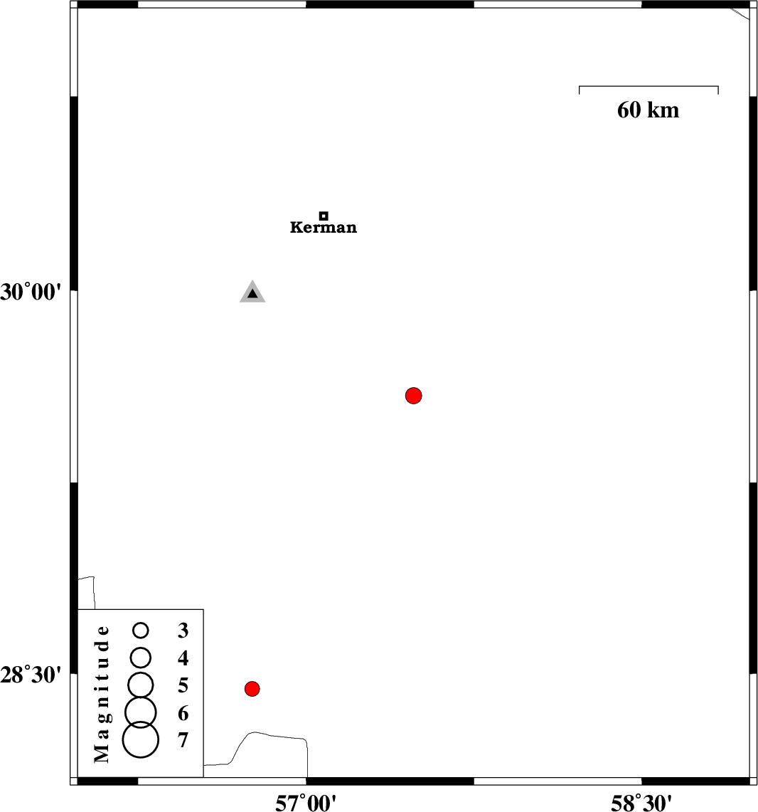 2010/02/16 | 08:18:59.4 | 11:48:59.4 | 29.59 | 57.48 | 6 | ML:3.2 | 86 km South-East of Kerman, Kerman Province |