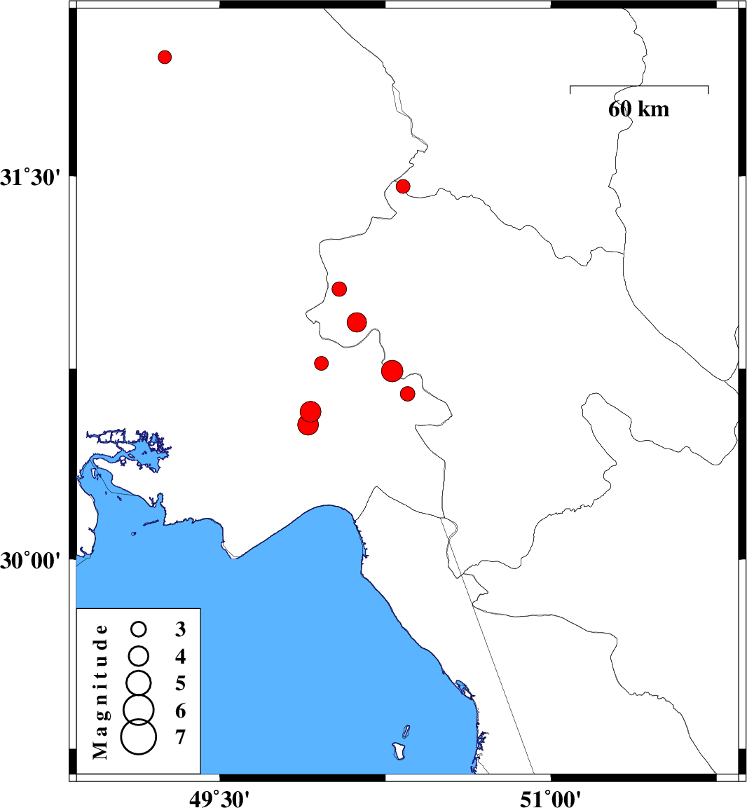 | 2010/02/11 | 21:07:52.6 | 00:37:52.6 | 30.93 | 50.12 | 15 | ML:3.9 | 39 km North-West of Behbahan, Khoozestan Province |