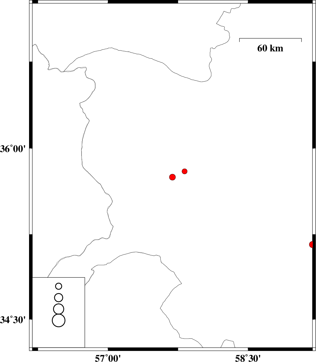 2010/02/28 | 10:17:57.9 | 13:47:57.9 | 35.75 | 57.69 | 44 | ML:3 | Khorasan(center) Province, 52 km South of Sabzevar | ||