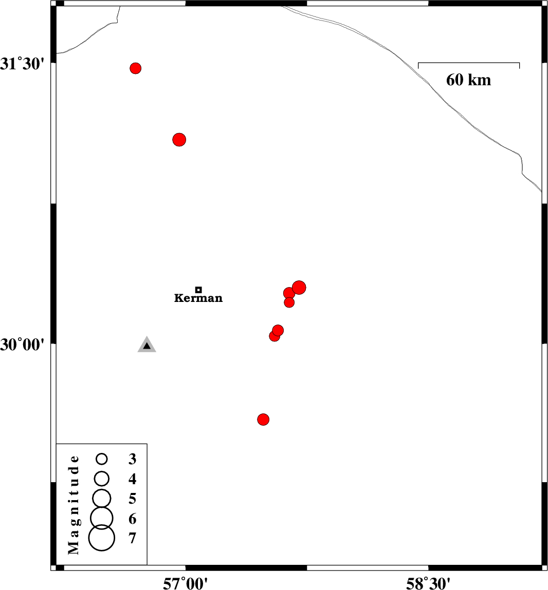 | 2010/03/08 | 16:39:35.2 | 20:09:35.2 | 30.3 | 57.7 | 14 | ML:3.8 | Kerman Province, 60 km East of Kerman | ||