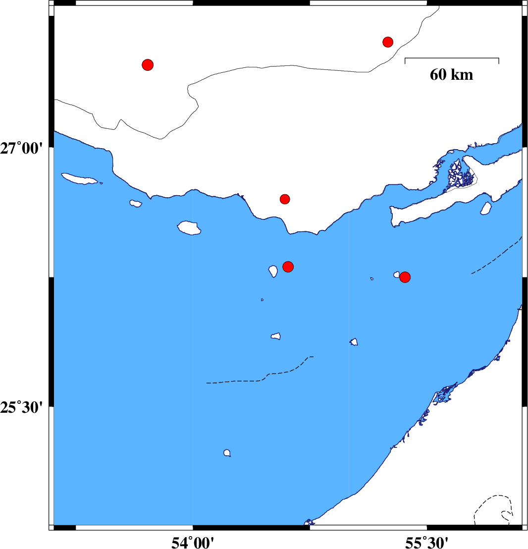 2010/03/14 | 15:50:59.8 | 19:20:59.8 | 26.25 | 55.36 | 18 | ML:3.1 | Persian Gulf, 53 km North-East of Abu Musa | ||