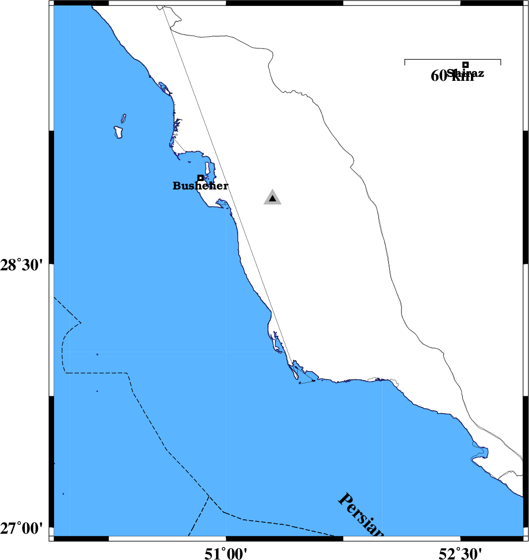 2010/03/15 | 20:03:08.6 | 23:33:08.6 | 28.45 | 51.4 | 39 | ML:3.3 | Bushehr Province, 23 km South of Khormog | ||
