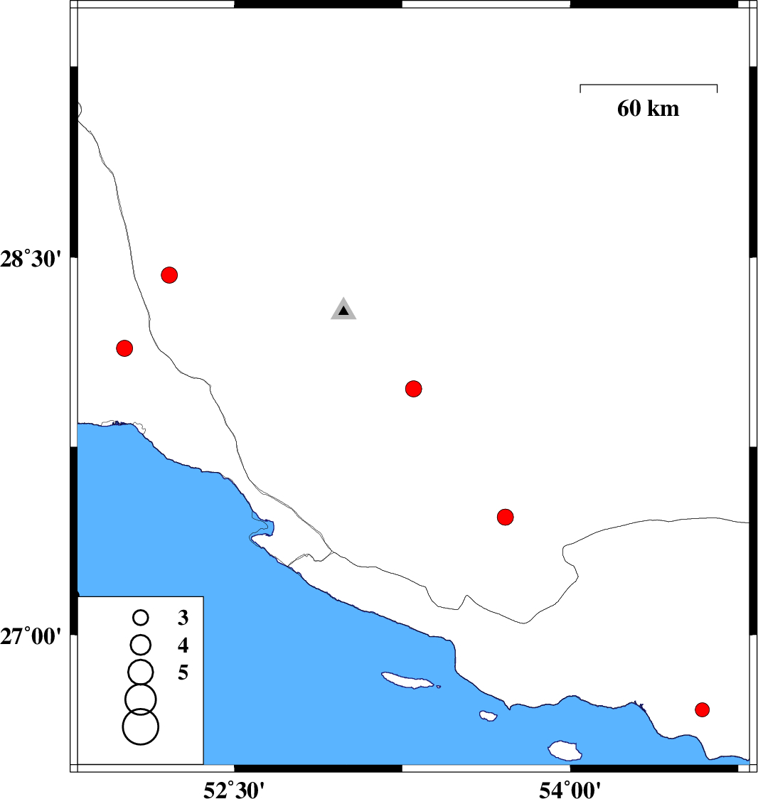 2010/03/14 | 06:38:46.5 | 10:08:46.5 | 26.7 | 54.59 | 14 | ML:2.8 | Hormozgan Province, 32 km North-West of Bandar-e lengeh | ||