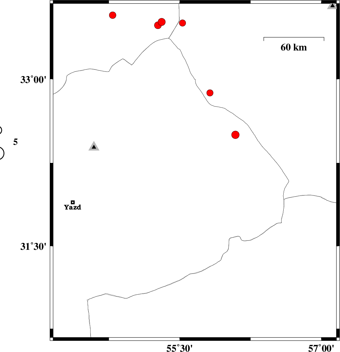 2010/03/18 | 15:09:57.6 | 18:39:57.6 | 32.17 | 55.66 | 14 | ML:3.2 | Yazd Province, 68 km North-East of Bafq | ||