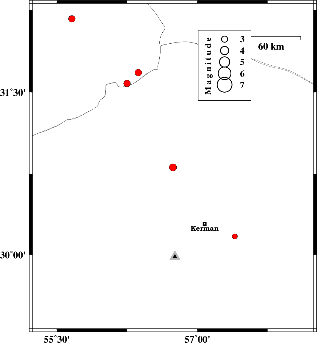 2010/03/20 | 06:02:50.3 | 09:32:50.3 | 30.17 | 57.4 | 8 | ML:2.6 | Kerman Province, 34 km South-East of Kerman | ||