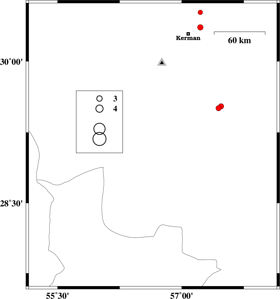 | 2010/03/08 | 16:39:35.2 | 20:09:35.2 | 30.3 | 57.7 | 14 | ML:3.8 | Kerman Province, 60 km East of Kerman | ||