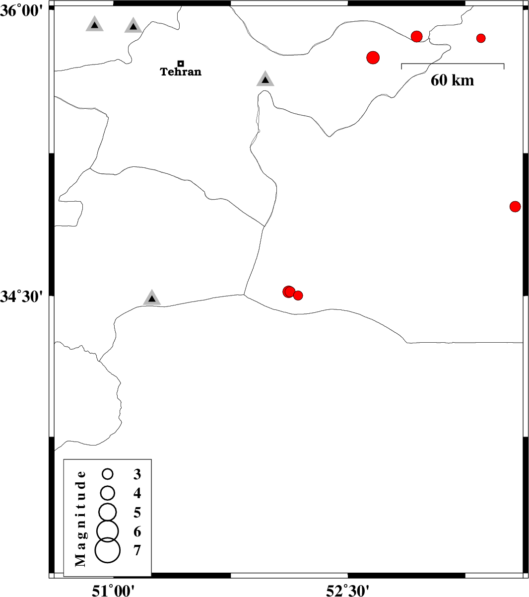 | 2009/07/04 | 15:20:29.8 | 19:50:29.8 | 34.52 | 52.12 | 18 | ML:2.7 | Semnan Province, 80 km South-West of Garmsar | ||