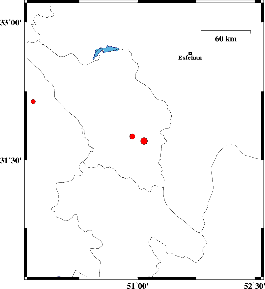 | 2009/07/08 | 14:44:50.9 | 19:14:50.9 | 31.71 | 51.08 | 41 | ML:3.9 | Chaharmahal Bakhtiari Province, 35 km South-West of Borujen | ||