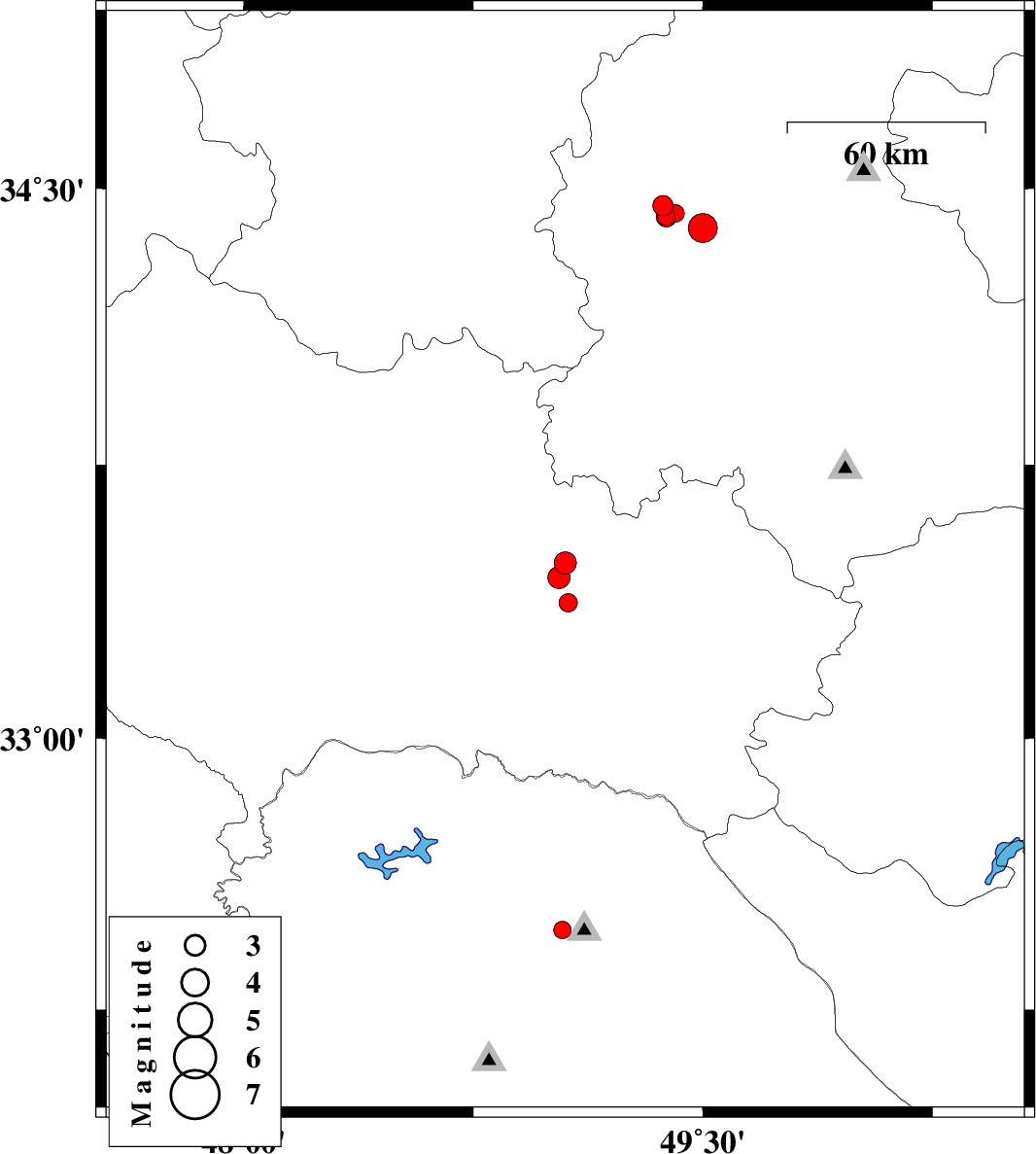 2009/07/25 | 20:37:33.1 | 01:07:33.1 | 33.59 | 49.04 | 15 | ML:3.2 | Lorestan Province, 12 km North of Dorud | ||
