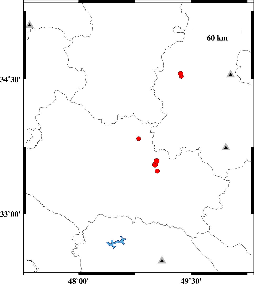 2009/07/25 | 20:37:33.1 | 01:07:33.1 | 33.59 | 49.04 | 15 | ML:3.2 | Lorestan Province, 12 km North of Dorud | ||