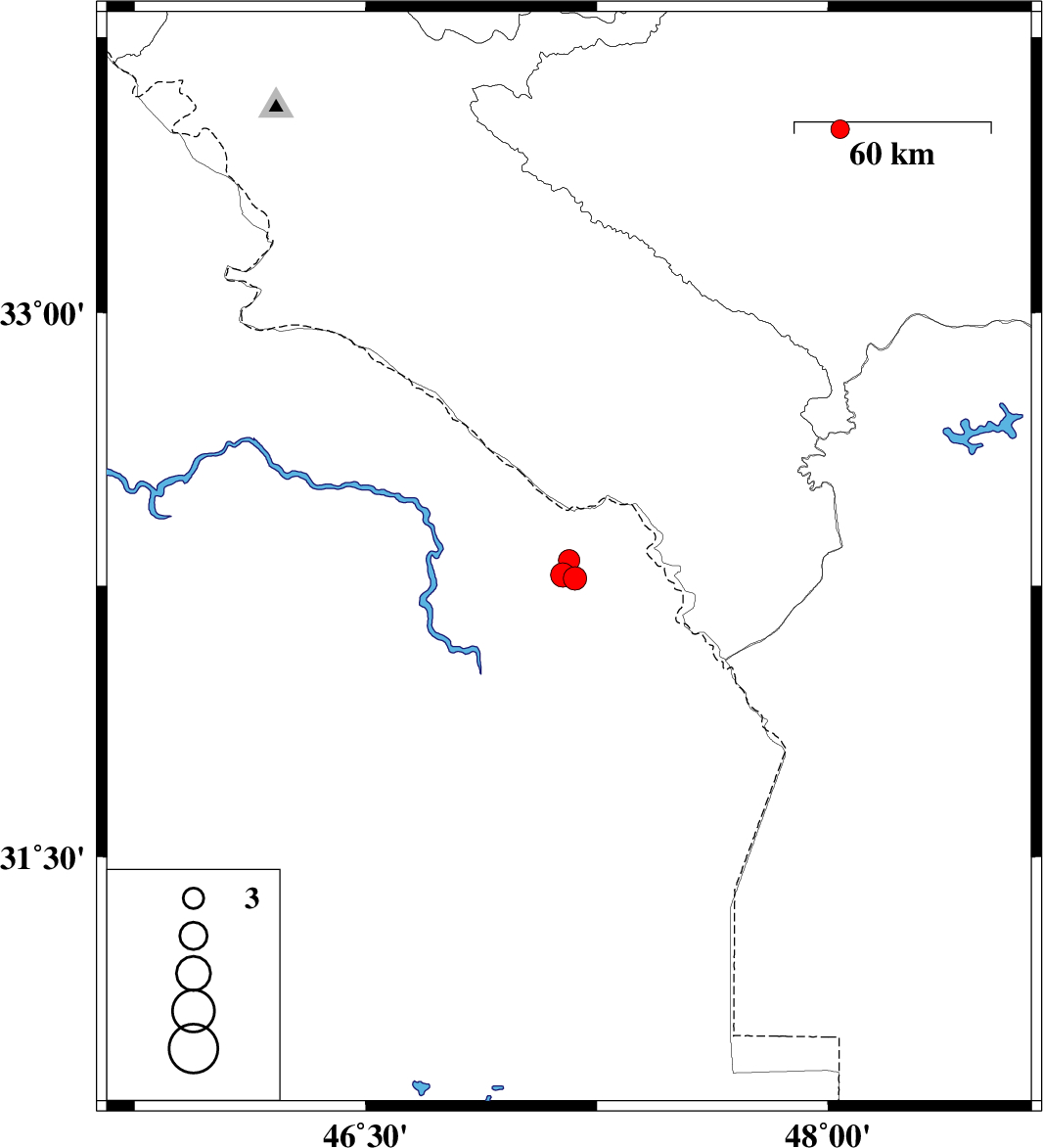 | 2009/08/05 | 23:13:29.7 | 03:43:29.7 | 32.27 | 47.18 | 14 | ML:3.4 | Iraq, 48 km South of Dehloran | ||