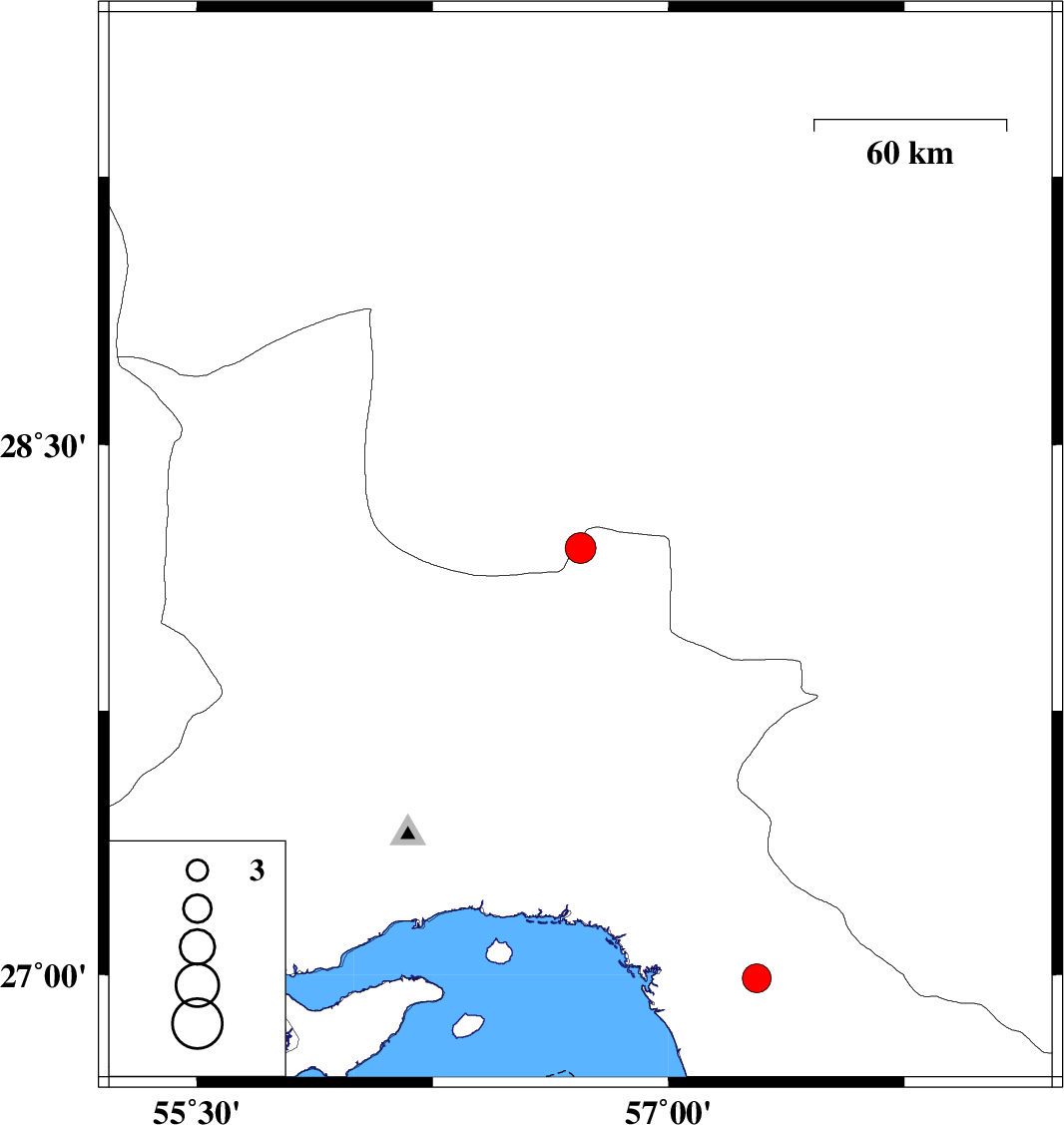 | 2009/08/07 | 18:59:33.9 | 23:29:33.9 | 26.99 | 57.28 | 18 | ML:4.1 | Hormozgan Province, 27 km South-East of Minab | ||