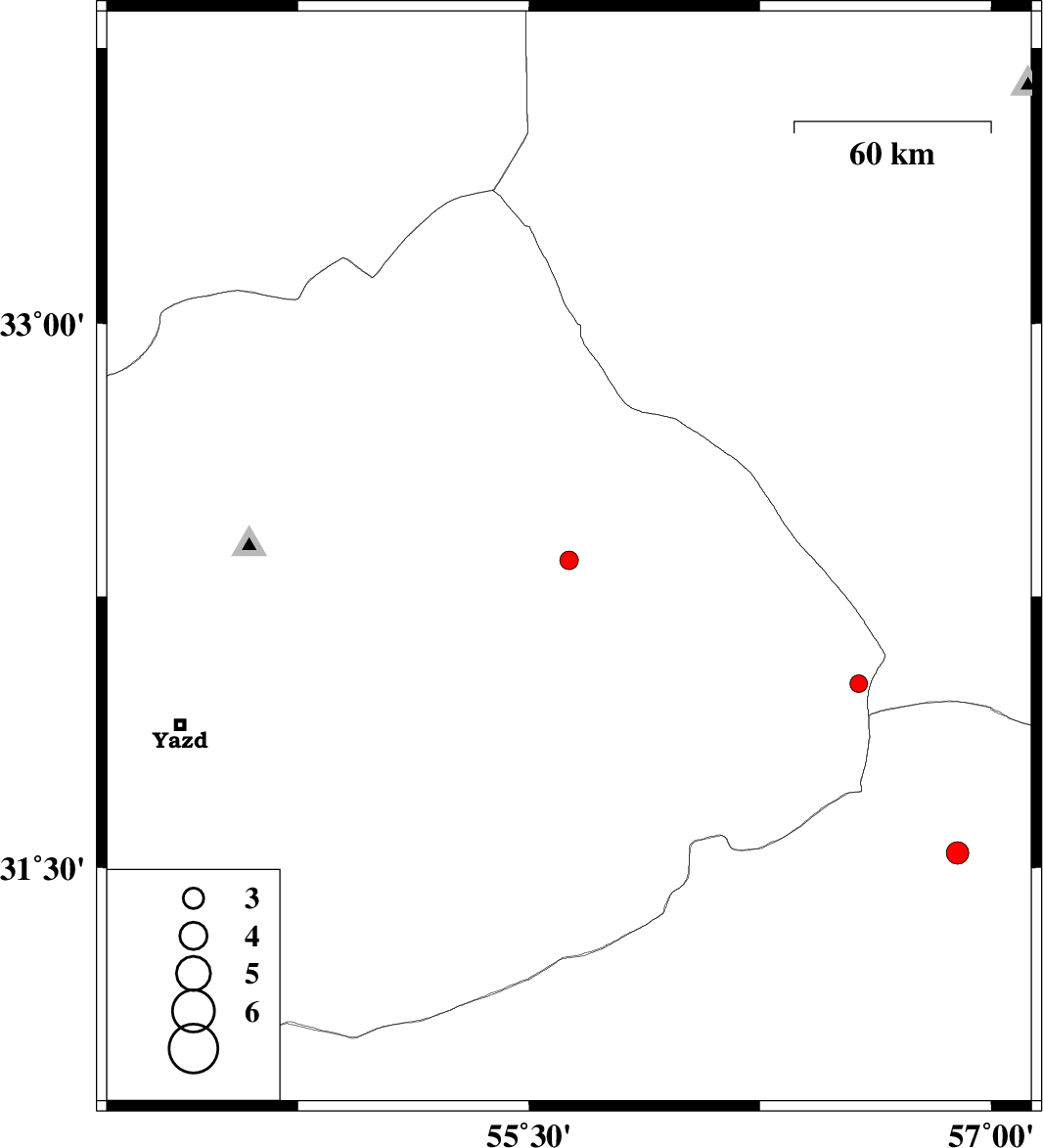 | 2009/08/16 | 08:56:18.3 | 13:26:18.3 | 32.35 | 55.63 | 14 | ML:2.7 | Yazd Province, 86 km North-East of Bafq | ||