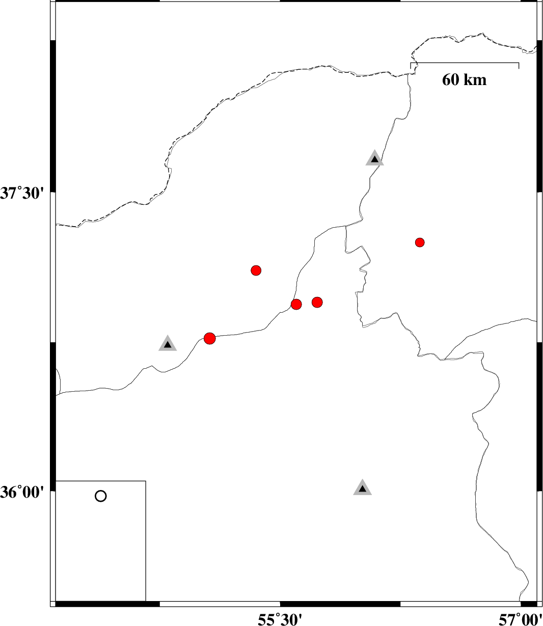 | 2009/08/20 | 23:19:20.9 | 03:49:20.9 | 36.95 | 55.73 | 6 | ML:2.9 | Semnan Province, 44 km South-East of Minodasht | ||