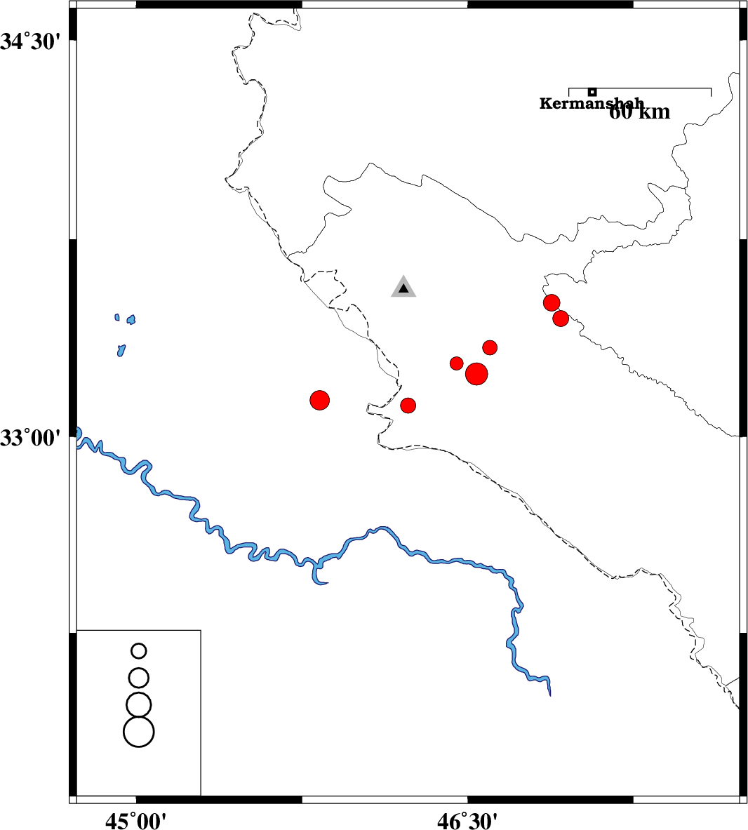 2009/09/03 | 14:10:45.8 | 18:40:45.8 | 33.28 | 46.45 | 14 | ML:2.7 | Ilam Province, 40 km South of Ilam | ||
