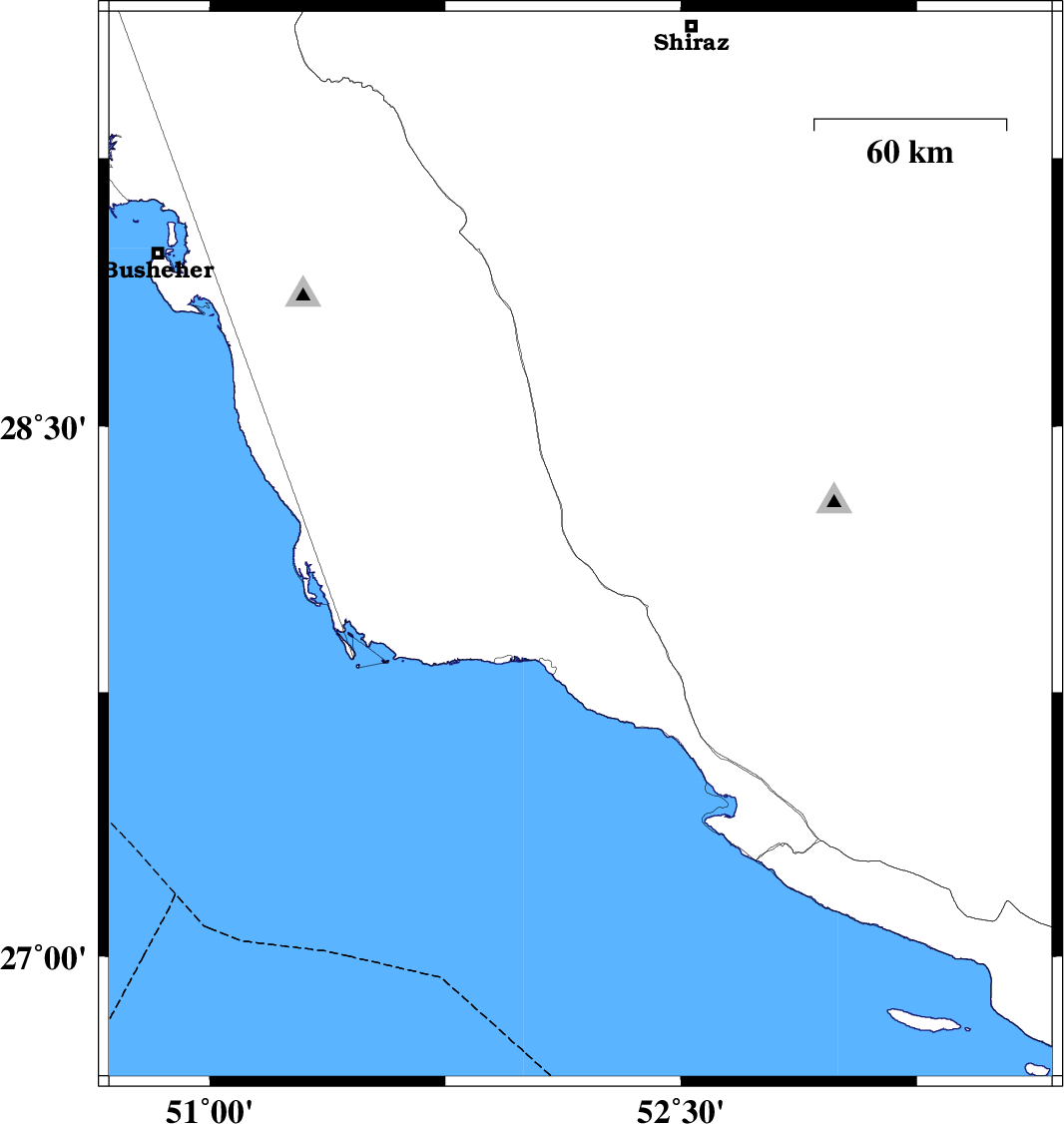 | 2010/03/27 | 00:48:01.8 | 05:18:01.8 | 28.07 | 53.32 | 43 | ML:2.9 | Fars Province, 53 km South-West of Jahrom | ||