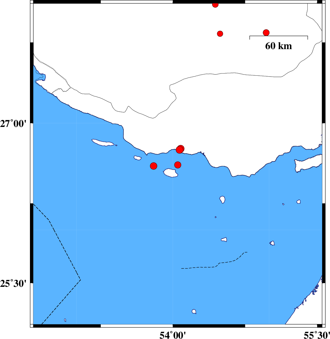 | 2009/09/08 | 08:26:50.4 | 12:56:50.4 | 26.6 | 53.8 | 46 | ML:3.2 | Persian Gulf | ||