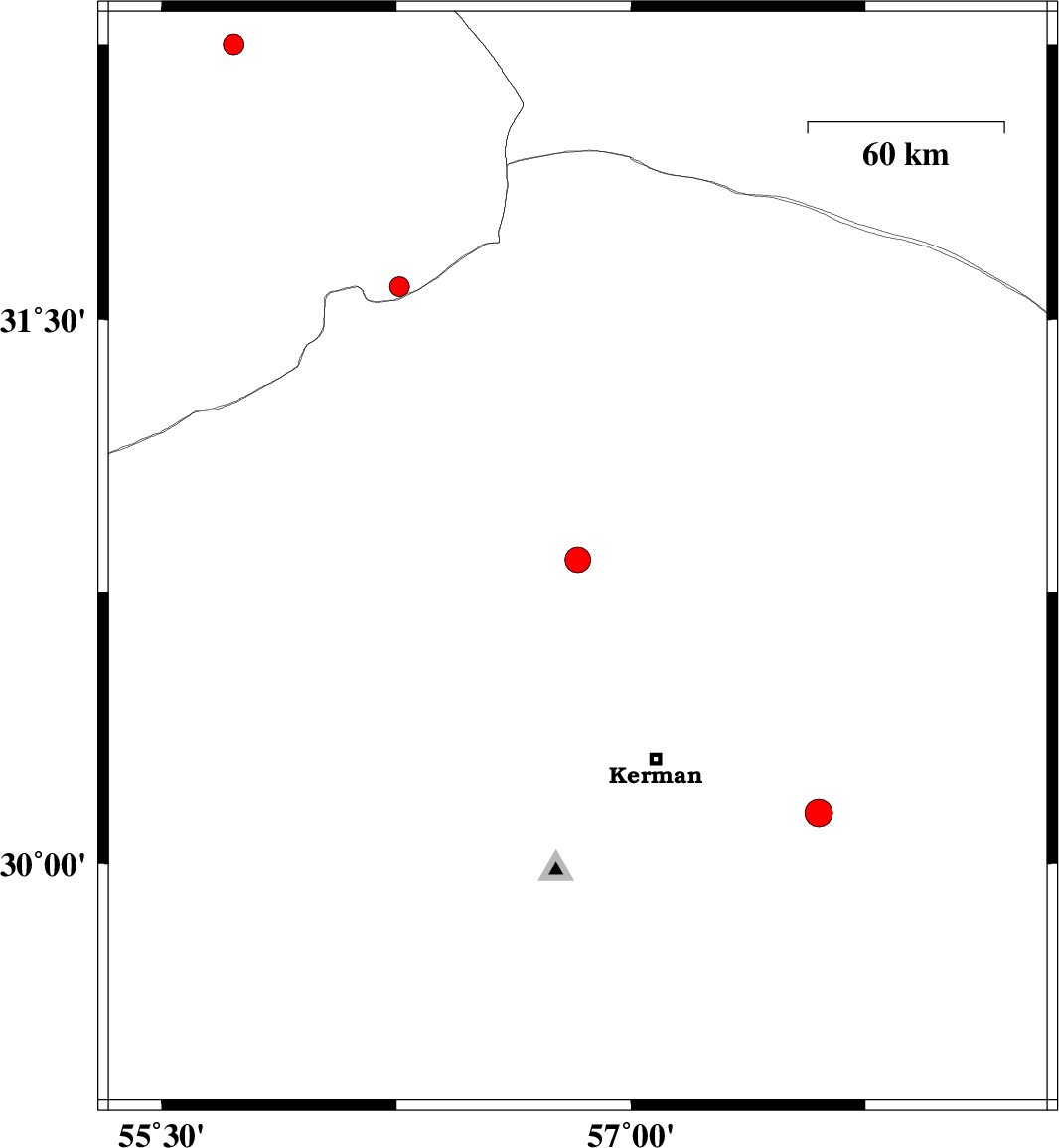 | 2009/10/21 | 01:44:37.5 | 05:14:37.5 | 30.14 | 57.6 | 15 | ML:3.9 | Kerman Province, 53 km South-East of Kerman |